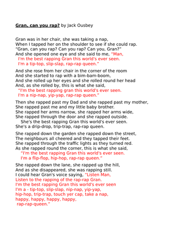These materials may contain links for third party websites. Gran was in her chair she was taking a nap When I tapped her on the shoulder to see if she could rap. Read poetry with your UKS2 class to develop spoken language practise memorisation try out performance skills and inspire powerful writing.